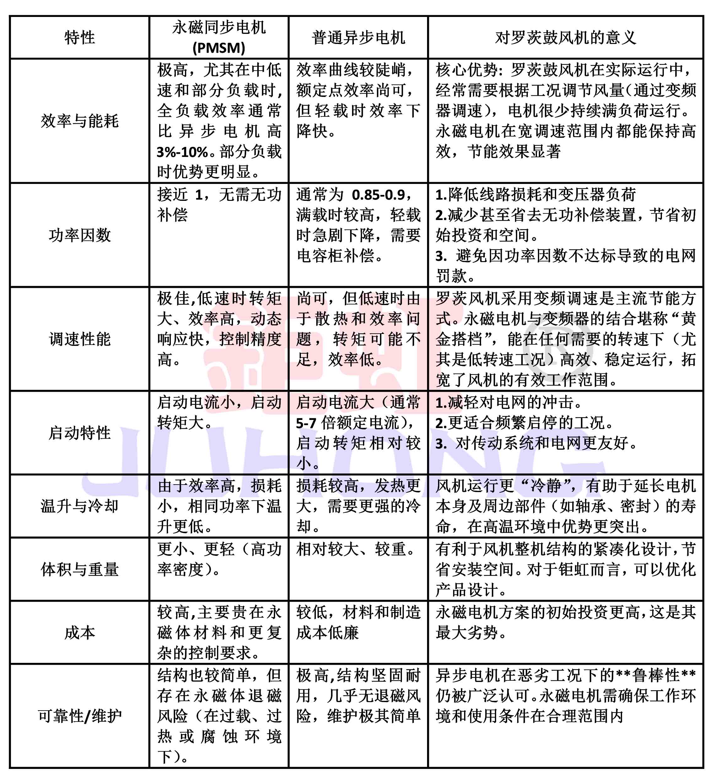 钜虹作为罗茨鼓风机的主要制造商之一,其产品线通常同时涵盖使用异步电机和永磁电机的机型。下面我将从原理出发,详细分析永磁同步电机与普通异步电机在罗茨鼓风机应用中的优势、劣势及能耗差异。